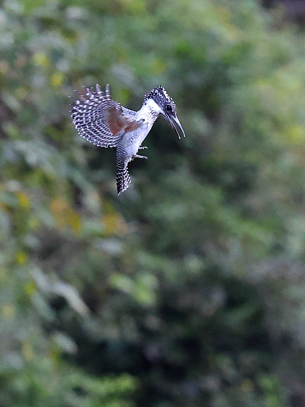 2025年 (秋 8) 先日、カワセミの観察中にヤマセミが遠くにやってきた。そこで、今回は過去にヤマセミが棲んでいた奥深い渓谷を訪ねてみた。ここはしばらくぶりでヤマセミがいるのかどうかも分からず、撮影の準備だけをして様子を見ることにした。 早朝の寒い中で待っていると、鋭い声とともに一羽が水面の近くを通過。それを見て寒さも忘れ、次にやって来るのを待つ。少し経った頃、もう一羽が水面の近くを飛んできて急上昇。続いて、前方の枝の中に止まった。そして、ホバリング。ところが、ホバリングをしながらこちらを向いた、正面の姿はピントを外してしまった。次の機会にはホバリングをしながら両翼を広げた、正面の姿を撮ってみたい。^^;; |