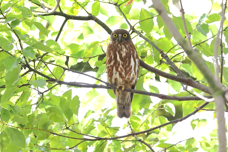 夏になるとアオバズクが渡ってくる大木を訪ねてみた。大宇宙のように広がる、大木の枝から枝へと丹念に探す。しばらく探していると、丸い目を開いたアオバズクが止まっていた。